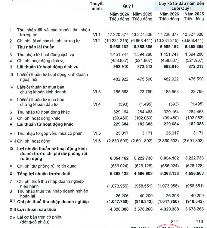 Điểm đáng chú ý nằm ở khu vực thu nhập ngoài lãi khi tiếp tục ghi nhận tốc độ tăng trưởng cao hơn. Hoạt động dịch vụ mang về 993 tỷ đồng, tăng 14%, trong khi kinh doanh ngoại hối đạt 483 tỷ đồng. Các mảng hoạt động khác cũng đóng góp tích cực, góp phần giúp tổng thu nhập hoạt động của ngân hàng tăng lên gần 8.905 tỷ đồng.