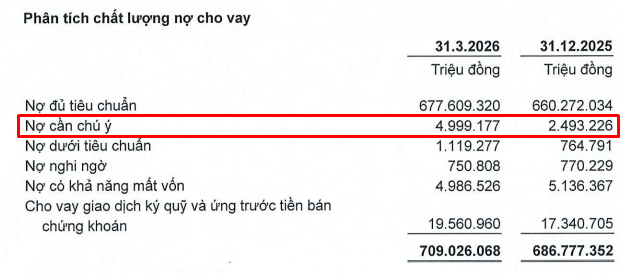 Tuy nhiên, diễn biến bên trong cơ cấu nợ cho thấy áp lực tiềm ẩn khi nợ dưới tiêu chuẩn tăng mạnh và đặc biệt là nợ cần chú ý (nhóm 2) đã tăng gấp đôi so với đầu năm, lên xấp xỉ 5.000 tỷ đồng. Đây là nhóm nợ có khả năng chuyển thành nợ xấu trong tương lai nếu không được kiểm soát hiệu quả.