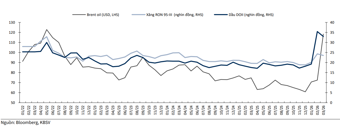 Giá năng lượng tăng không chỉ tác động trực tiếp đến nhóm giao thông mà còn lan tỏa sang nhiều nhóm hàng khác, đặc biệt là nhà ở và vật liệu xây dựng. Theo KBSV, nguồn cung dầu toàn cầu nhiều khả năng tiếp tục trong trạng thái thắt chặt trong giai đoạn 2026-2027, kể cả khi căng thẳng địa chính trị hạ nhiệt trong ngắn hạn. Trong kịch bản cơ sở, giá dầu Brent được dự báo duy trì ở mức cao, dao động quanh 85–95 USD/thùng.