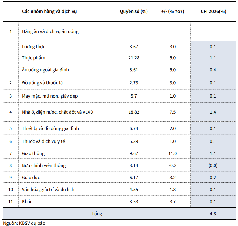 Trong kịch bản cơ sở, KBSV ước tính nhóm nhà ở, điện nước, chất đốt và vật liệu xây dựng có thể tăng khoảng 7,5% YoY trong năm 2026, qua đó đóng góp khoảng 1,4 điểm phần trăm vào CPI chung.