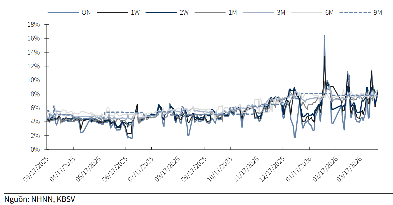 Tuy nhiên, trạng thái này không duy trì lâu khi thị trường vẫn ghi nhận tình trạng thiếu hụt thanh khoản cục bộ trong một số thời điểm. Đáng chú ý, trước Tết Nguyên đán và các giai đoạn đầu, cuối tháng 3/2026, lãi suất liên ngân hàng kỳ hạn qua đêm có thời điểm tăng vọt lên trên 10%, phản ánh áp lực thanh khoản ngắn hạn.