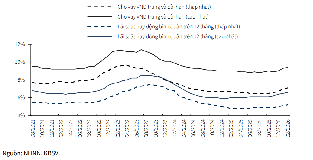 Theo nhận định của KBSV, mặt bằng lãi suất nhiều khả năng đã đạt đỉnh vào đầu quý II/2026, song xu hướng giảm rõ rệt sẽ chỉ xuất hiện trong nửa cuối năm.