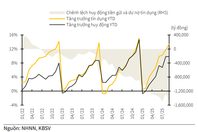 Dù vậy, triển vọng nửa cuối năm được đánh giá tích cực hơn. KBSV kỳ vọng lãi suất sẽ giảm rõ rệt khoảng 0,5–1%/năm so với hiện tại nhờ một số yếu tố hỗ trợ. Trong đó, dòng vốn từ đầu tư công khi được đẩy mạnh giải ngân sẽ quay trở lại hệ thống ngân hàng, cải thiện thanh khoản. Đồng thời, nếu căng thẳng địa chính trị hạ nhiệt, áp lực lên lạm phát và tỷ giá giảm bớt sẽ tạo điều kiện để NHNN linh hoạt hơn trong điều hành.