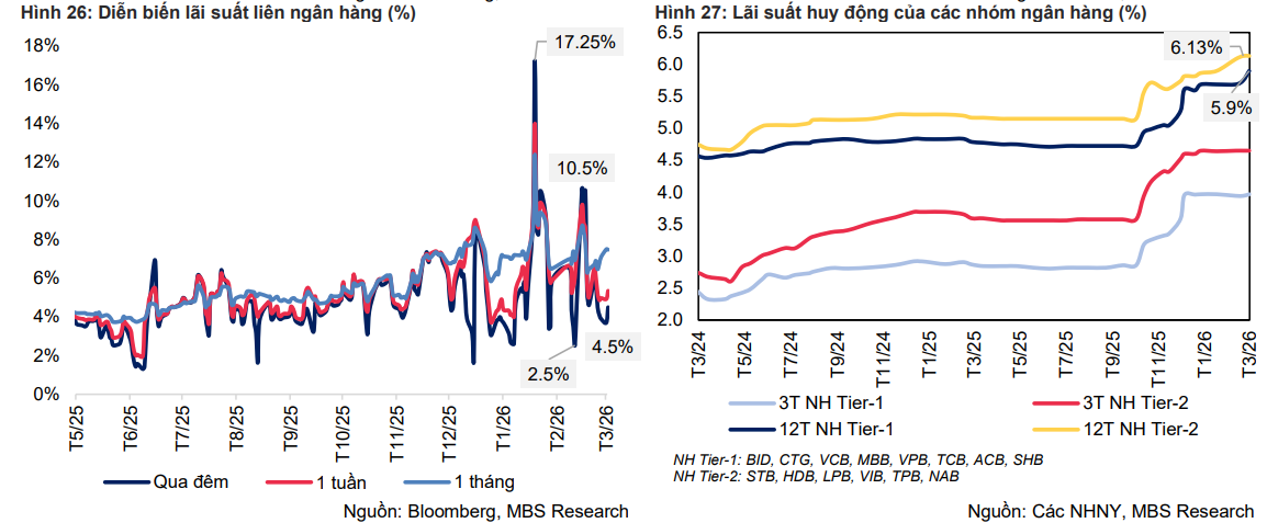 Theo MBS, áp lực này nhiều khả năng sẽ tiếp diễn trong năm 2026 khi nhu cầu vốn cho các dự án đầu tư công và phát triển hạ tầng gia tăng mạnh nhằm hỗ trợ tăng trưởng kinh tế. Điều này đặt ra thách thức lớn cho chính sách tiền tệ: vừa phải duy trì mặt bằng lãi suất hợp lý để hỗ trợ doanh nghiệp, vừa phải kiểm soát rủi ro lạm phát và ổn định tỷ giá.