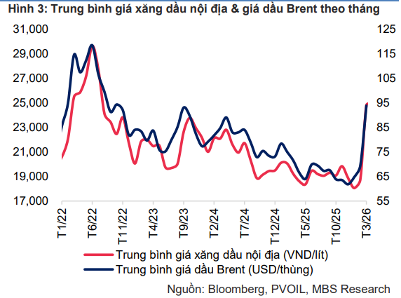Điểm đáng chú ý, theo MBS, là cú sốc từ thị trường năng lượng toàn cầu. Căng thẳng địa chính trị tại Trung Đông leo thang từ cuối tháng Hai đã đẩy giá dầu tăng mạnh trong đầu tháng Ba, có thời điểm tiệm cận 120 đô la Mỹ mỗi thùng – mức cao nhất trong bốn năm. Với một nền kinh tế nhập khẩu ròng năng lượng như Việt Nam, biến động này nhanh chóng truyền dẫn vào giá xăng dầu trong nước, khi giá bán lẻ tăng hơn 32% so với tháng trước.