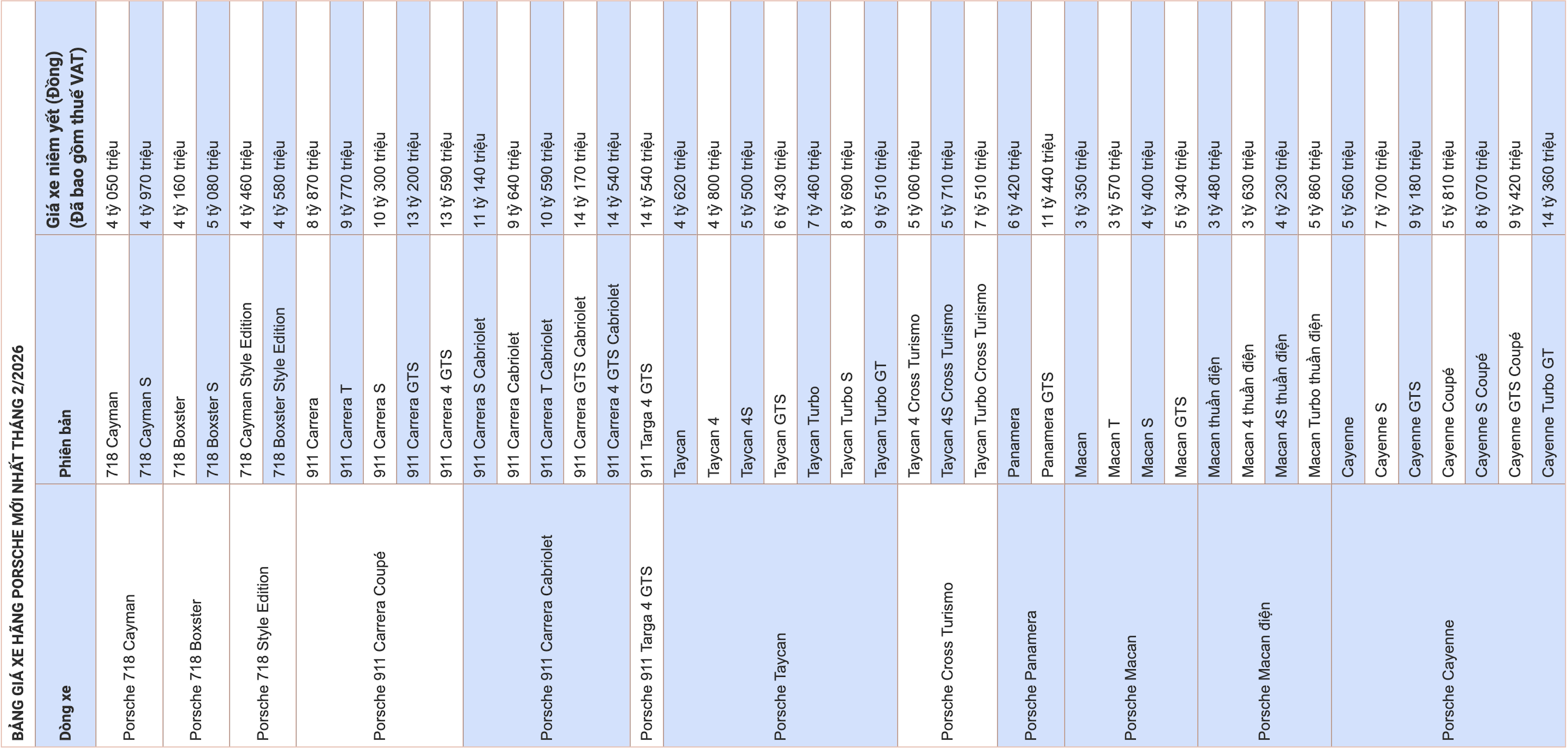 Dưới đây là bảng giá xe Porsche mới nhất tháng 2/2026 tại Việt Nam, mang tính tham khảo và có thể thay đổi tùy thời điểm, cấu hình xe cũng như chính sách của nhà phân phối. Thông tin giá bán sẽ giúp người tiêu dùng có cái nhìn tổng quan và chủ động hơn trong việc cân nhắc tài chính trước khi lựa chọn mẫu xe phù hợp.