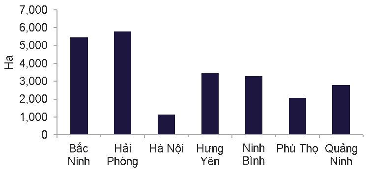 Bắc Ninh và Hải Phòng tiếp tục là hai địa phương dẫn đầu với lần lượt 5.452 ha và 5.796 ha đất KCN. Tuy nhiên, sự mở rộng cũng ghi nhận rõ tại các tỉnh vệ tinh mới nổi như Ninh Bình và Phú Thọ, nơi đang tích cực đẩy nhanh tiến độ hạ tầng công nghiệp.