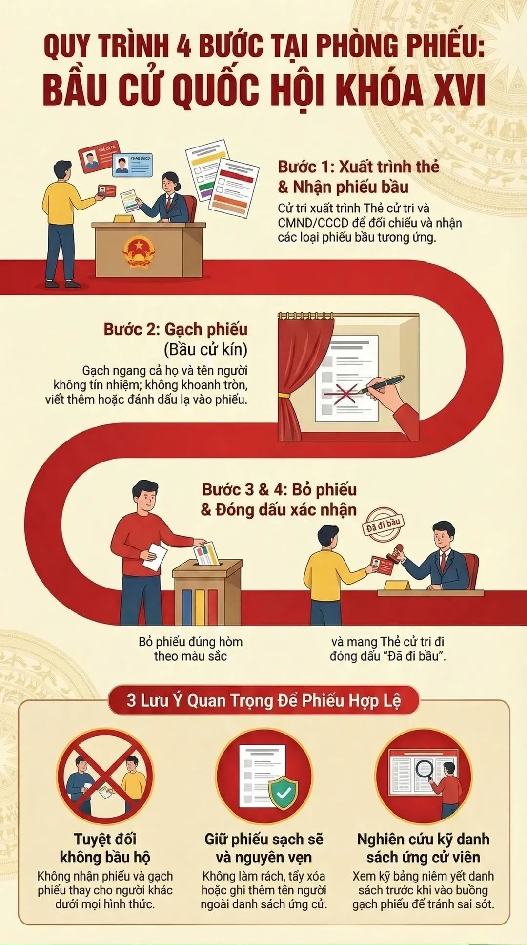 Quy trình này được thiết kế rõ ràng với bốn bước cơ bản, giúp cử tri dễ dàng thực hiện quyền và nghĩa vụ công dân của mình.