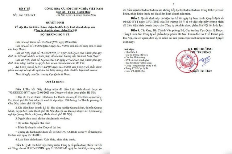 Cụ thể, Giấy chứng nhận đủ điều kiện kinh doanh dược số 793/ĐKKDD-BYT, được Bộ Y tế cấp ngày 03/01/2023 theo Quyết định số 01/QĐ-BYT, chính thức bị thu hồi kể từ ngày 19/01/2026. Loại hình kinh doanh bị thu hồi giấy phép là hoạt động xuất khẩu, nhập khẩu thuốc.