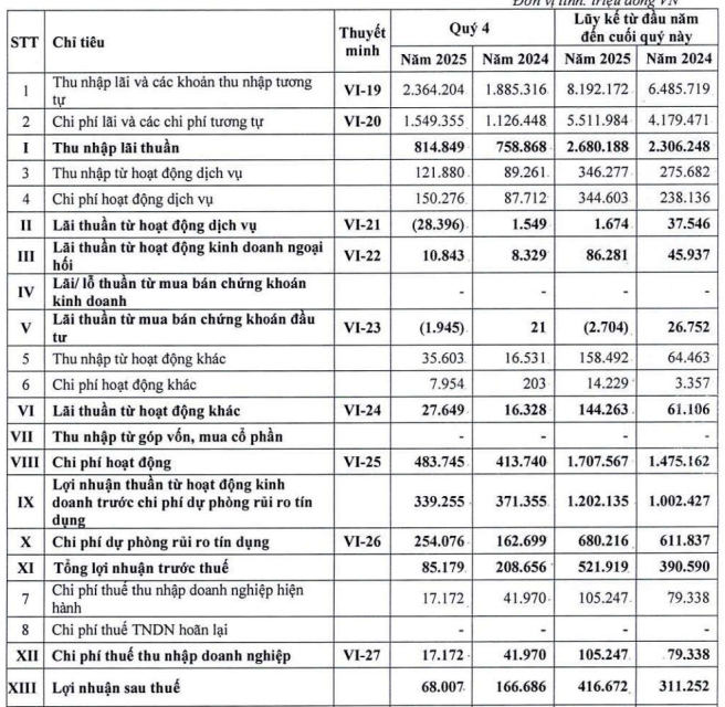 Tổng thu nhập hoạt động (TOI) quý 4 đạt 823 tỷ đồng, tăng 5% so với cùng kỳ, trong khi chi phí hoạt động tăng mạnh 17% lên 484 tỷ đồng. Do đó, lợi nhuận thuần từ hoạt động kinh doanh giảm 9%, còn 339 tỷ đồng. Đáng chú ý, chi phí dự phòng rủi ro tín dụng tăng 56%, từ 163 tỷ đồng lên 254 tỷ đồng, trực tiếp bào mòn lợi nhuận và là nguyên nhân chủ yếu khiến kết quả quý 4 lao dốc.