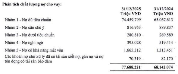 Chất lượng tài sản là điểm đáng chú ý khi tổng nợ xấu (nhóm 3-5) ở mức 2.341 tỷ đồng, tăng 11,4%. Tại ngày 31/12/2025, tỷ lệ nợ xấu (NPL) của BVBank ở mức 3,01% vượt ngưỡng an toàn 3% theo quy định của Ngân hàng Nhà nước Việt Nam. Theo quy định, mức nợ xấu dưới 3% được xem là giới hạn kiểm soát rủi ro tín dụng và phản ánh sức khỏe tài chính tối thiểu của các ngân hàng.