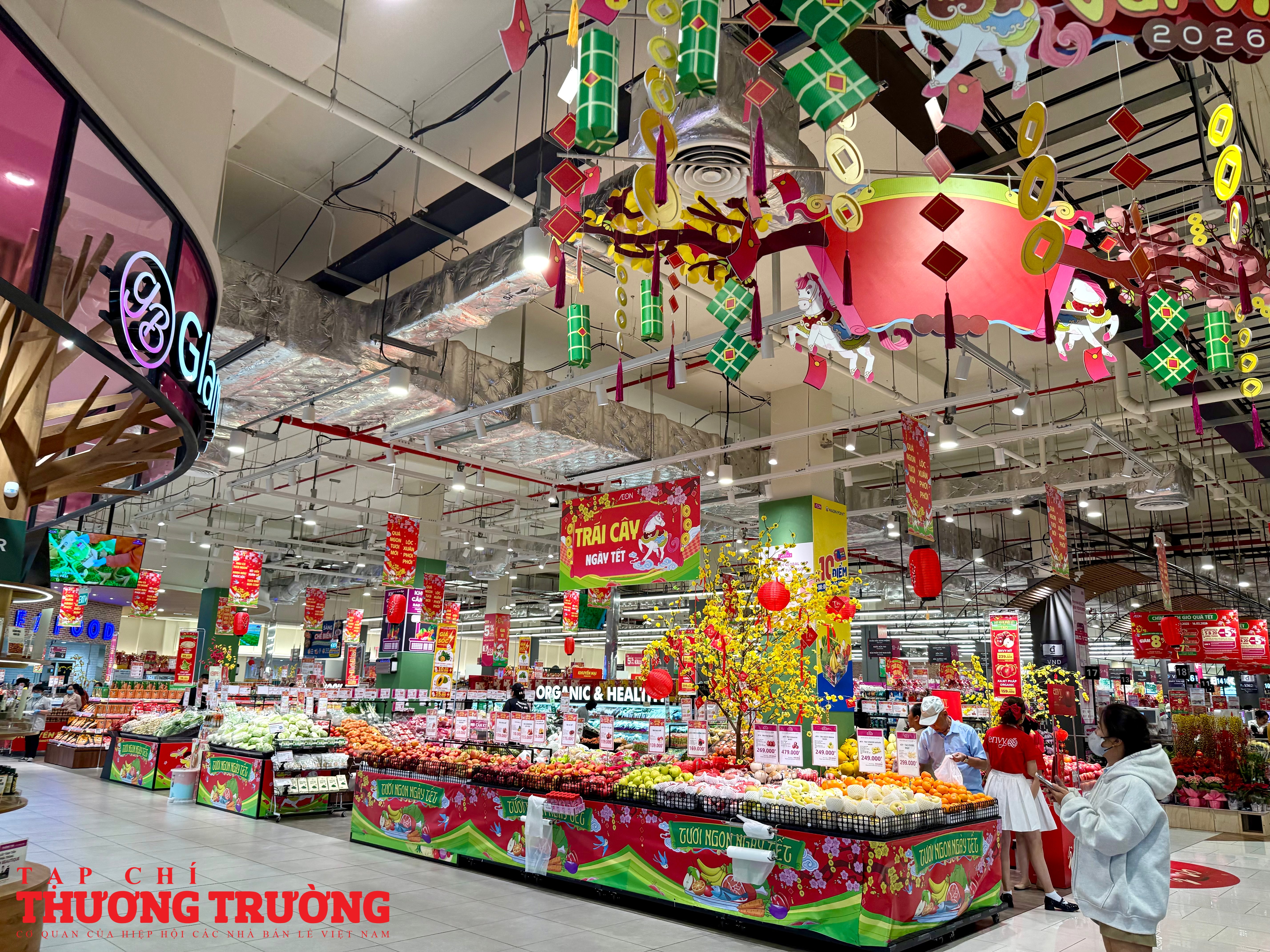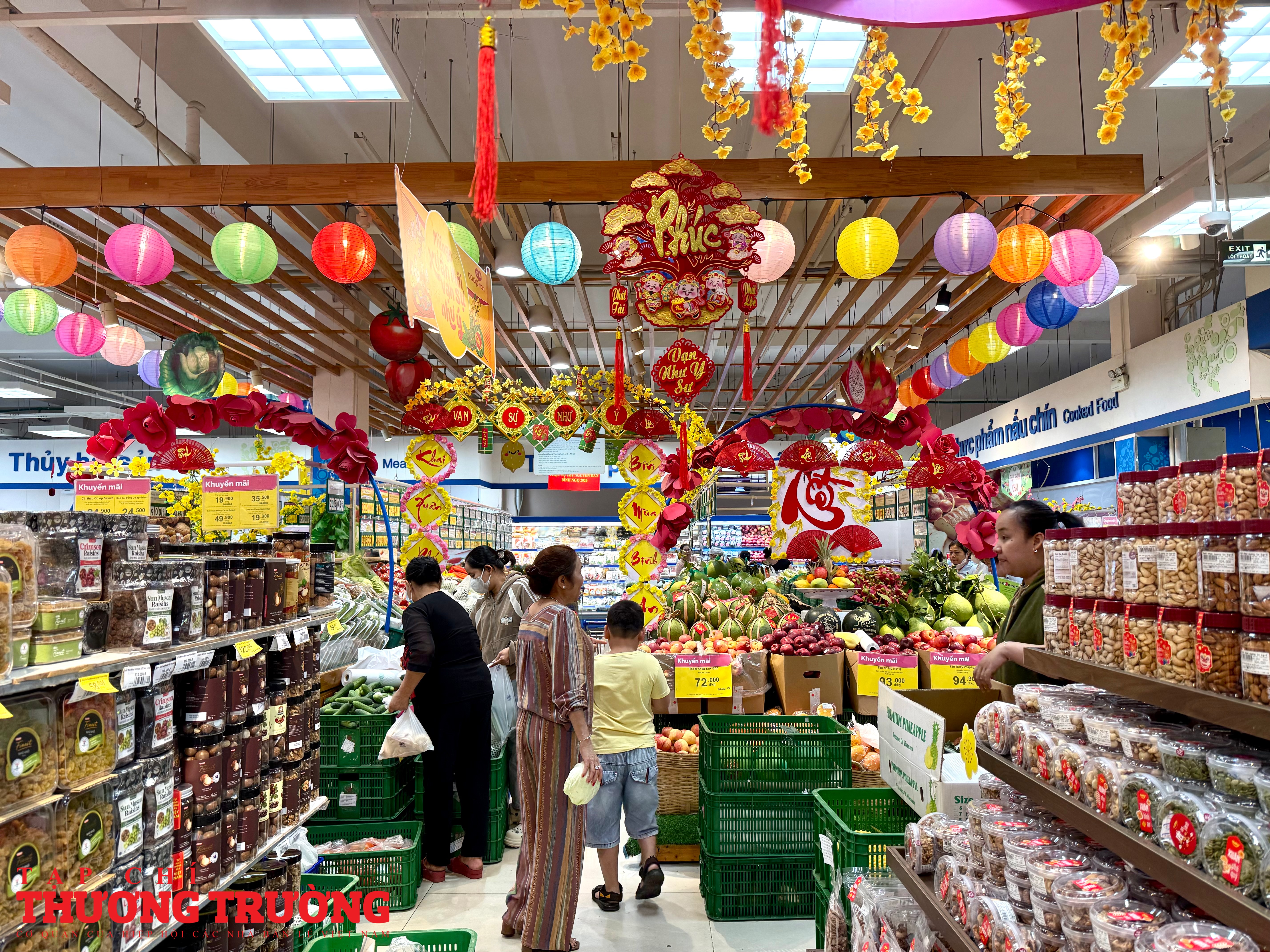 Tại một siêu thị ở phường Thủ Đức, các quầy tính tiền hoạt động liên tục. Nhân viên được tăng cường điều tiết khách, thông báo thời gian đóng cửa để người dân chủ động mua sắm. Một số kệ hàng xuất hiện tình trạng trống cục bộ, nhất là nhóm bánh chưng, giò chả, thực phẩm chế biến sẵn, những mặt hàng được nhiều gia đình lựa chọn cho bữa cơm tất niên.