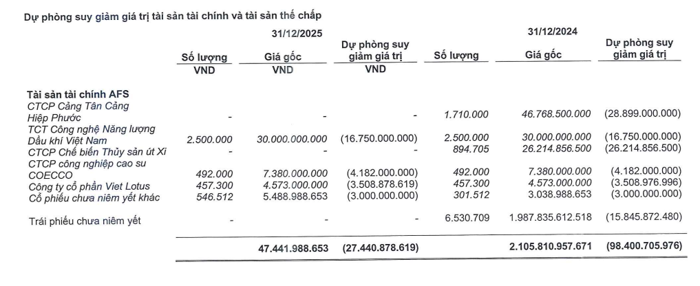 Danh mục AFS tại cuối năm 2025 chủ yếu tập trung vào một số khoản đầu tư cổ phiếu như Cảng Tân Cảng Hiệp Phước, CTCP Công nghệ Năng lượng Dầu khí Việt Nam, COCCO, Viet Lotus và nhóm cổ phiếu chưa niêm yết khác. Trong đó, các khoản dự phòng lớn nhất vẫn đến từ cổ phiếu CTCP Công nghệ Năng lượng Dầu khí Việt Nam (16,75 tỷ đồng) và COCCO (4,18 tỷ đồng), song mức trích lập hầu hết không tăng thêm so với năm 2024.