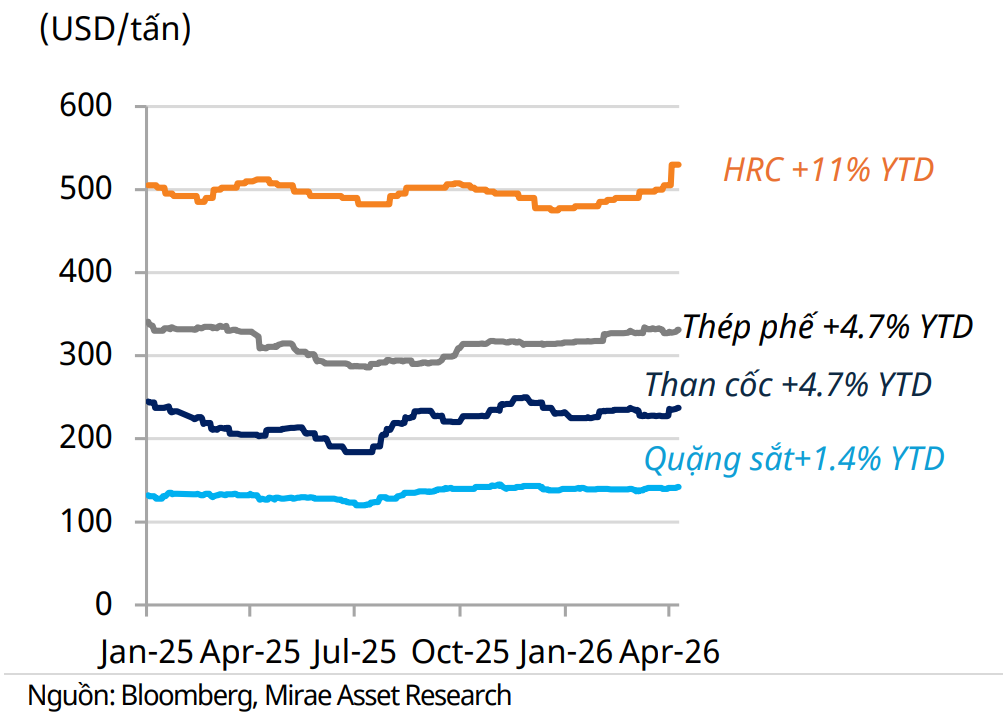 Ngay trong quý I/2026, các yếu tố chi phí đã trở thành động lực chính định hình giá thép. Theo MSVN, quặng sắt – chiếm phần lớn trong cơ cấu giá thành – đã tăng lên mức 100–108 USD/tấn, cao hơn khoảng 7–10% so với vùng đáy đầu năm. Song song, giá than luyện cốc cũng tăng khoảng 5% trong cùng giai đoạn. Hai loại nguyên liệu này vốn chiếm tới 70% chi phí sản xuất thép, nên biến động của chúng nhanh chóng lan sang giá bán.