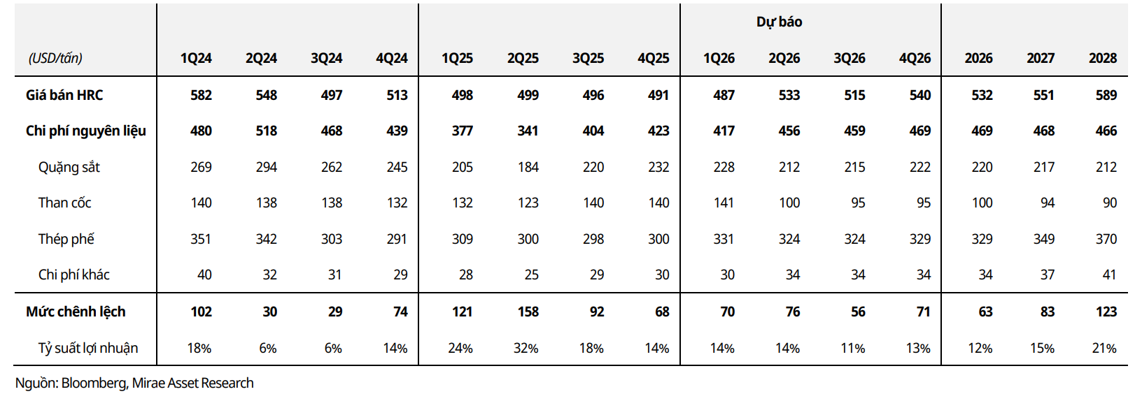 Theo dự phóng của MSVN, mức chênh lệch giữa giá bán HRC và chi phí nguyên liệu đã phục hồi mạnh từ đầu tháng 4/2026. Trong bảng dự báo, biên lợi nhuận toàn ngành năm 2026 ước đạt khoảng 12%, cao hơn mức 11–14% của các quý gần nhất, nhờ chênh lệch giá bán – chi phí được mở rộng trở lại. Cụ thể, giá bán HRC trung bình năm 2026 dự kiến khoảng 532 USD/tấn, trong khi chi phí nguyên liệu vào khoảng 469 USD/tấn, tạo ra mức chênh lệch 63 USD/tấn.