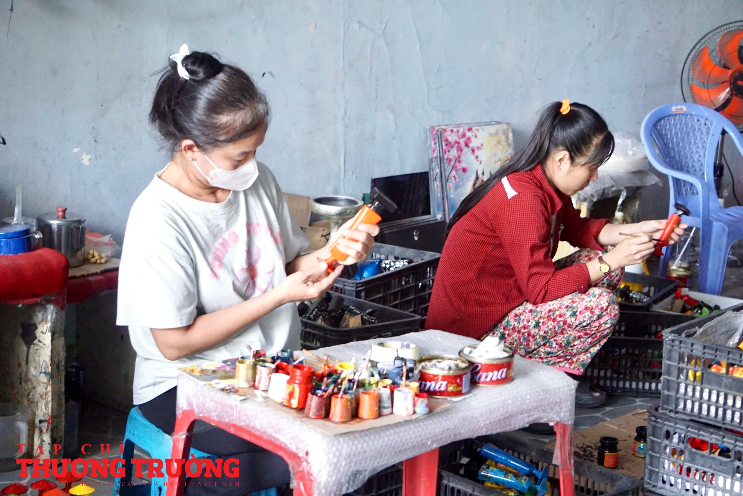 Nghệ nhân chú trọng từng bước sơn và mài sản phẩm, một công đoạn bắt buộc phải kiên trì nhiều tháng và qua hơn 25 bước phức tạp mới đạt chuẩn truyền thống.Tác phẩm sơn mài hoàn chỉnh với họa tiết thủ công tinh xảo, phản ánh kỹ thuật và thẩm mỹ riêng biệt của Tương Bình Hiệp, nơi sản xuất cả tranh nghệ thuật lẫn đồ mỹ nghệ ứng dụng.Bức tranh lớn ghép nhiều tấm thể hiện sinh hoạt đời thường, cho thấy sự đa dạng trong dòng sản phẩm của làng nghề.Nghệ nhân tập trung vẽ chi tiết trên sản phẩm nhỏ, thể hiện tinh hoa nghề sơn mài qua từng nét chấm, mài và vẽ.Bàn xưởng trưng bày nhiều nguyên liệu và bán thành phẩm, phản ánh quy trình thủ công đòi hỏi thời gian và kinh nghiệm thay vì máy móc hiện đại.Dù còn ít, đội ngũ thợ già và thợ trẻ vẫn hợp sức sản xuất và chuẩn bị đơn hàng cho thị trường Tết và dịp lễ minh chứng nghề không dễ mai một khi còn “lửa” truyền nghề.Những hình khối và sản phẩm mới chờ hoàn thiện, cho thấy lao động thủ công vẫn là tim mạch của nghề sơn mài Bình Dương.Những chiếc bình, lọ sơn mài với gam màu chuyển sắc rực rỡ được phủ nhiều lớp sơn và đánh bóng thủ công, tạo độ sâu và độ bóng đặc trưng kỹ thuật truyền thống làm nên thương hiệu Tương Bình Hiệp.Các chi tiết chân đế, phụ kiện gỗ sau khi được tạo hình sẽ trải qua nhiều công đoạn như sơn lót, sơn màu, vẽ họa tiết và mài phẳng trước khi hoàn thiện, quy trình có thể kéo dài hàng tuần, thậm chí hàng tháng.Nghệ nhân cao tuổi tỉ mỉ xử lý từng chi tiết nhỏ. Ở Tương Bình Hiệp, nhiều gia đình vẫn duy trì sản xuất tại nhà, truyền nghề qua nhiều thế hệ như một cách gìn giữ bí quyết sơn ta truyền thống.Những nắp hộp sơn mài được trang trí họa tiết thủ công bằng kỹ thuật vẽ và thếp vàng, sau đó phủ sơn bảo vệ và đánh bóng, tạo nên bề mặt óng ánh đặc trưng của sản phẩm cao cấp.Không gian xưởng trưng bày đa dạng sản phẩm từ bình hoa, khay, hộp trang trí đến tranh sơn mài. Mỗi sản phẩm là kết quả của hàng chục công đoạn thủ công như hom vóc, sơn lót, mài, vẽ, phủ và đánh bóng.