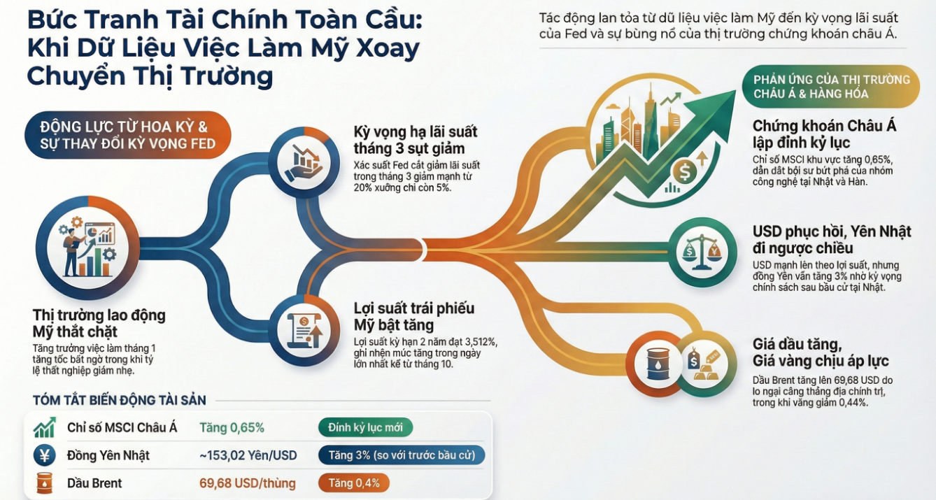 Tâm điểm của thị trường tuần này là loạt dữ liệu kinh tế Mỹ. Báo cáo công bố hôm thứ Tư cho thấy tăng trưởng việc làm bất ngờ tăng tốc trong tháng 1, trong khi tỷ lệ thất nghiệp giảm nhẹ.