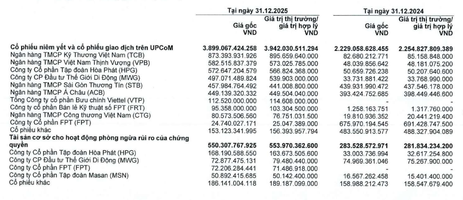 Tại thời điểm cuối năm 2025, danh mục tài sản tài chính FVTPL của HSC có giá gốc gần 13.000 tỷ đồng, giảm khoảng 2.500 tỷ đồng so với cuối quý 3/2025. Trong đó, sự sụt giảm chủ yếu đến từ danh mục cổ phiếu khi giá gốc các khoản đầu tư cổ phiếu giảm mạnh từ hơn 6.300 tỷ đồng xuống còn dưới 3.900 tỷ đồng chỉ sau một quý.