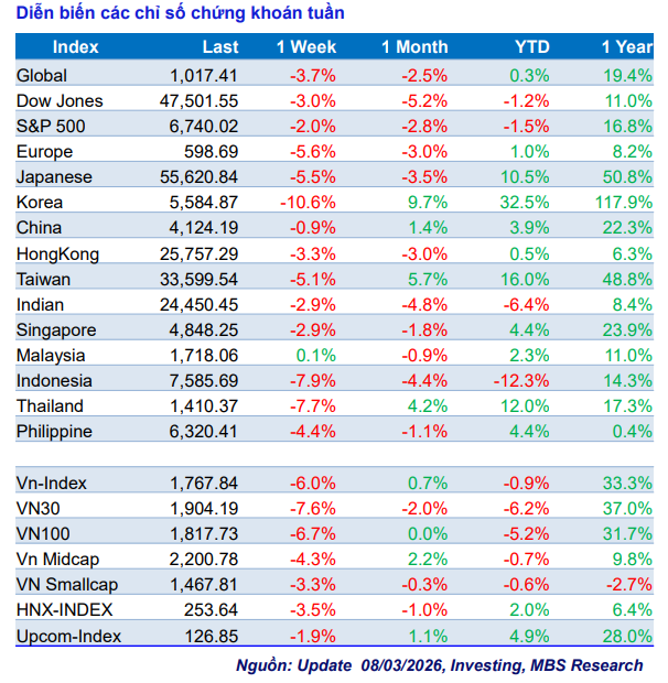 Tác động từ cú sốc địa chính trị khiến thị trường chứng khoán Việt Nam ghi nhận tuần giảm mạnh nhất kể từ đợt biến động thuế quan hồi tháng 4/2025. Kết thúc tuần giao dịch, VN-Index dừng ở mức 1.767,84 điểm, giảm 112,5 điểm tương đương 5,98%. Áp lực giảm chủ yếu đến từ các cổ phiếu vốn hóa lớn như VIC, VHM, TCB và BID. Chỉ số VN30 giảm mạnh hơn với mức giảm 7,6%, trong khi nhóm Midcap và Smallcap lần lượt giảm 4,3% và 3,3%.