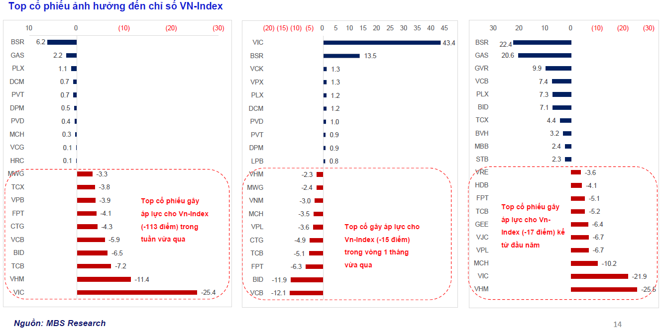 Độ rộng thị trường nghiêng hẳn về phía tiêu cực khi phần lớn các nhóm ngành giảm điểm. Những nhóm chịu áp lực lớn nhất gồm cổ phiếu công nghệ, bán lẻ và nhóm Viettel. Ngược lại, một số ngành hưởng lợi từ biến động giá hàng hóa lại đi ngược xu hướng chung, trong đó nổi bật là dầu khí và hóa chất.