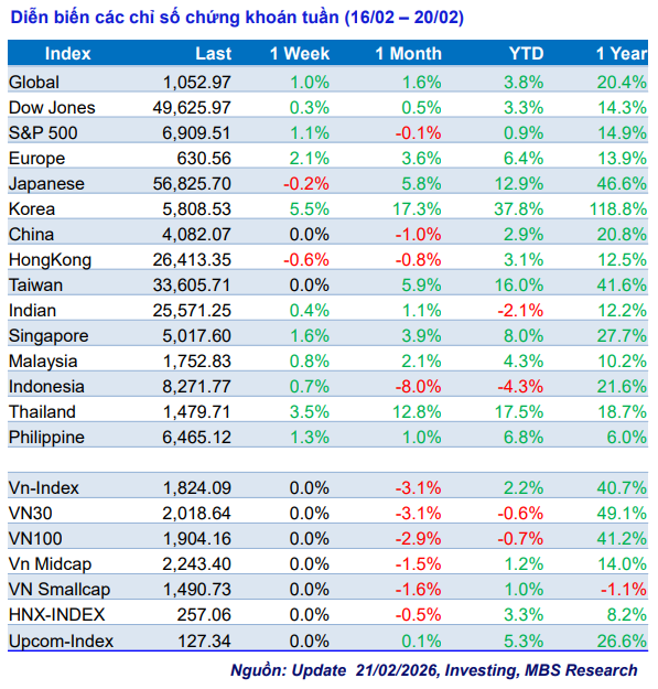 Trong nước, thị trường chứng khoán đã có tuần hồi phục ấn tượng sau ba tuần giảm liên tiếp. Chốt tuần trước Tết, VN-Index đạt 1.824,09 điểm, tăng 68,6 điểm (+3,91%), qua đó lấy lại một phần đáng kể mức giảm gần 180 điểm trước đó. Đà tăng được dẫn dắt bởi các cổ phiếu vốn hóa lớn như VIC, VHM, VPB, MBB và HDB.