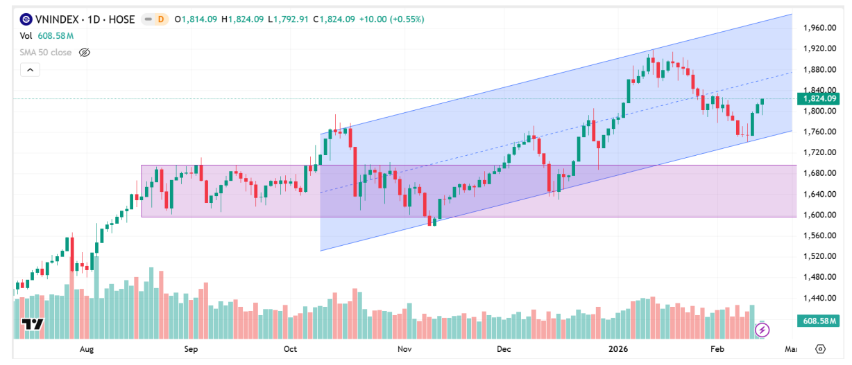 Về mặt kỹ thuật, VN-Index đang có vùng hỗ trợ quan trọng tại 1.780–1.800 điểm và kháng cự mạnh quanh vùng đỉnh cũ 1.920 điểm. Việc chỉ số phục hồi mạnh trước Tết giúp lấy lại các đường trung bình quan trọng, tạo nền tảng cho khả năng tiếp diễn xu hướng tích cực nếu thanh khoản cải thiện khi nhà đầu tư quay lại giao dịch sau kỳ nghỉ dài ngày.