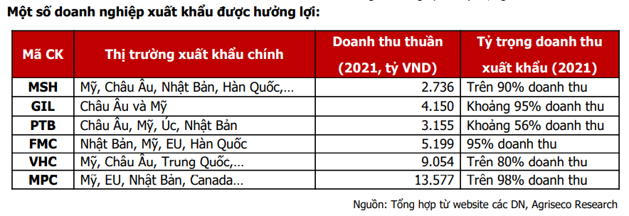 Theo dữ liệu của Tổng cục Hải quan, hàng dệt may, giày dép, gỗ và thủy sản là các nhóm ngành xuất khẩu chủ lực của Việt Nam, với tổng tỷ trọng xuất khẩu sang thị trường Mỹ và EU lần lượt 36% và 26%. Một số doanh nghiệp hoạt động trong hai ngành này, có nền tảng cơ bản tốt và được hưởng lợi từ tỷ giá bao gồm: MSH, GIL, PTB, FMC, VHC, MPC.