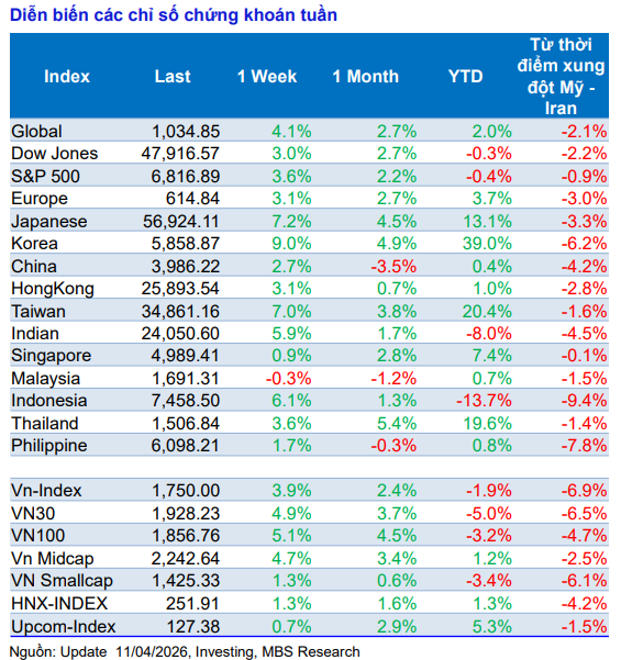 Thị trường tài chính toàn cầu ghi nhận một tuần tăng mạnh sau thông tin Mỹ và Iran đạt được thỏa thuận ngừng bắn kéo dài hai tuần, công bố ngày 7/4. Diễn biến này giúp cải thiện đáng kể tâm lý nhà đầu tư, kích hoạt dòng tiền quay trở lại các tài sản rủi ro. Tại Mỹ, các chỉ số chính đồng loạt tăng mạnh và ghi nhận tuần tăng tốt nhất kể từ tháng 11/2025. S&P 500 tăng 3,6%, Nasdaq Composite tăng 4,7% và Dow Jones Industrial Average tăng 3%.