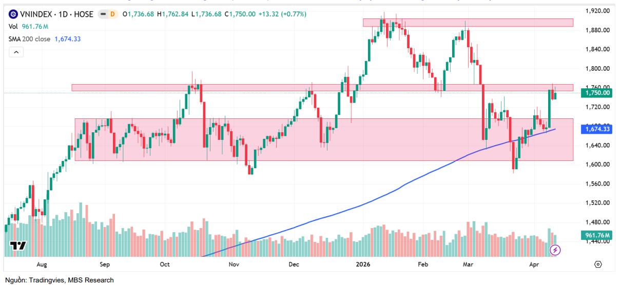 Tuy nhiên, về mặt kỹ thuật, VN-Index đang đối mặt với vùng kháng cự mạnh 1.760 – 1.770 điểm, tương ứng vùng GAP được hình thành trong nhịp giảm sâu ngày 09/03. Thực tế, chỉ số đã chạm mức cao nhất 1.763 điểm nhưng đóng cửa thấp cho thấy áp lực bán tại vùng này là đáng kể.