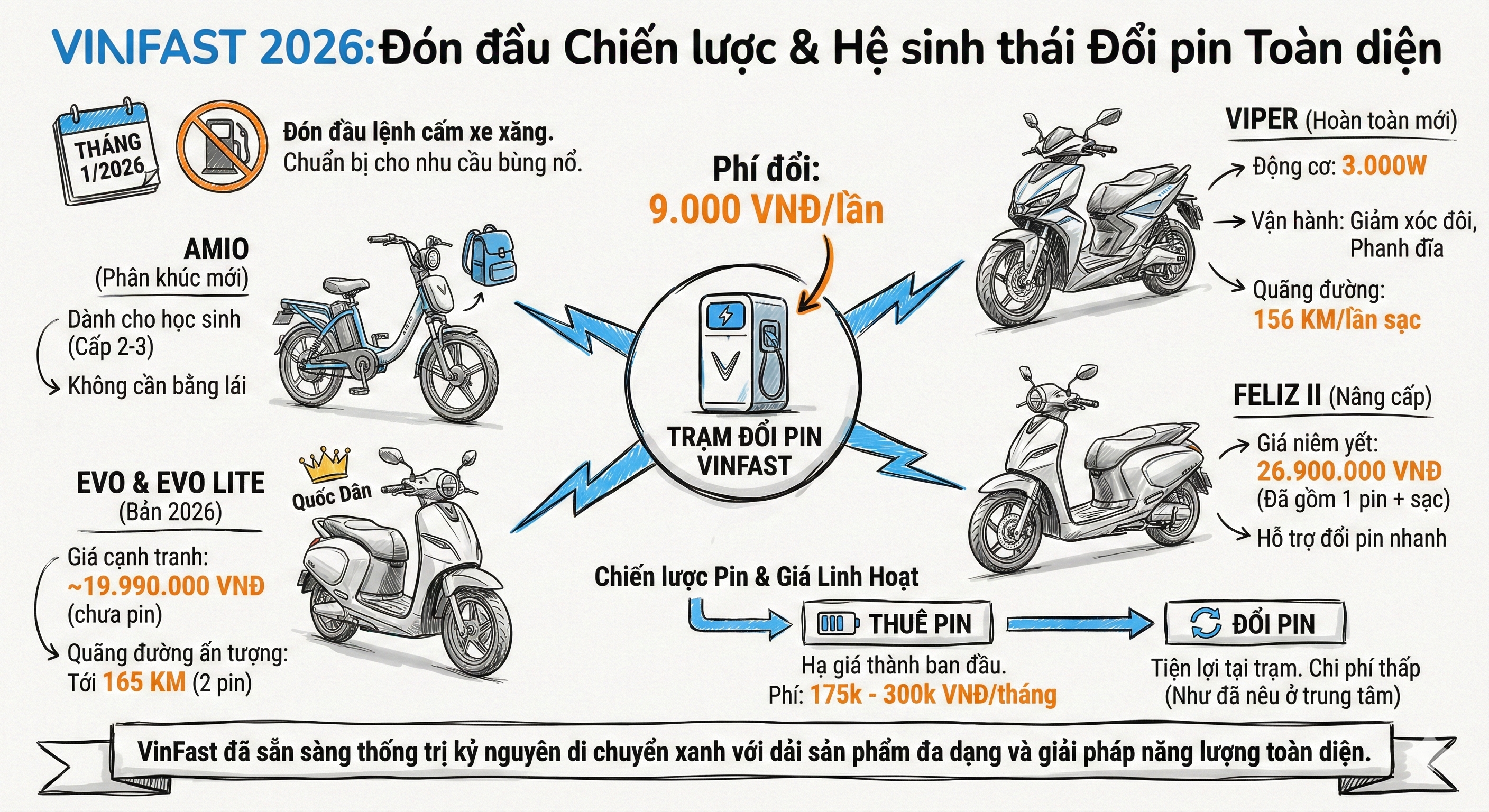 Thị trường xe máy điện Việt Nam đang đứng trước "điểm bùng phát". Sự thống trị của VinFast về hạ tầng, sự trở lại của Honda và các chính sách quyết liệt từ cơ quan quản lý sẽ khiến 6 tháng đầu năm 2026 trở thành giai đoạn hỗn loạn nhưng đầy cơ hội. Người tiêu dùng thông thái cần cân nhắc kỹ bài toán sạc/đổi pin và lộ trình cấm đường trước khi xuống tiền mua xe trong năm nay.