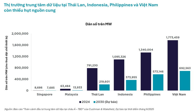 Đặc biệt, trong năm 2025, trung tâm dữ liệu (data centre) trở thành loại hình bất động sản có giá trị đầu tư lớn nhất tại Đông Nam Á. Khu vực Johor tiếp tục thu hút nhu cầu lan tỏa từ Singapore, trong khi Thái Lan, Indonesia, Philippines và Việt Nam vẫn là những thị trường còn thiếu hụt nguồn cung và có dư địa tăng trưởng đáng kể. Nhất là trong bối cảnh nhu cầu về hạ tầng số, điện toán đám mây, AI và nền kinh tế số tại Việt Nam đang gia tăng nhanh chóng.
