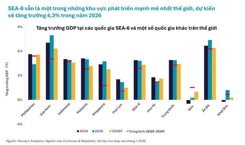 Tại Việt Nam, nền kinh tế ghi nhận mức tăng trưởng GDP thực cao nhất trong nhóm SEA-6 năm 2025, đạt 8,0%, cao hơn đáng kể so với mức trung bình 7,1% trước đại dịch.