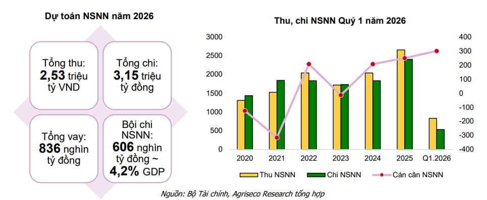 Ngân sách nhà nước cũng ghi nhận thặng dư lớn, với 248,6 nghìn tỷ đồng trong năm 2025 và hơn 229 nghìn tỷ đồng trong quý I/2026. Cán cân ngân sách năm 2026 dự kiến bội chi hơn 600 nghìn tỷ đồng. Số vốn này kỳ vọng sẽ giúp củng cố nền tảng tài khóa, giảm áp lực nợ công, tạo dư địa trong việc chi cho đầu tư, triển khai cơ sở hạ tầng giao thông trọng điểm.