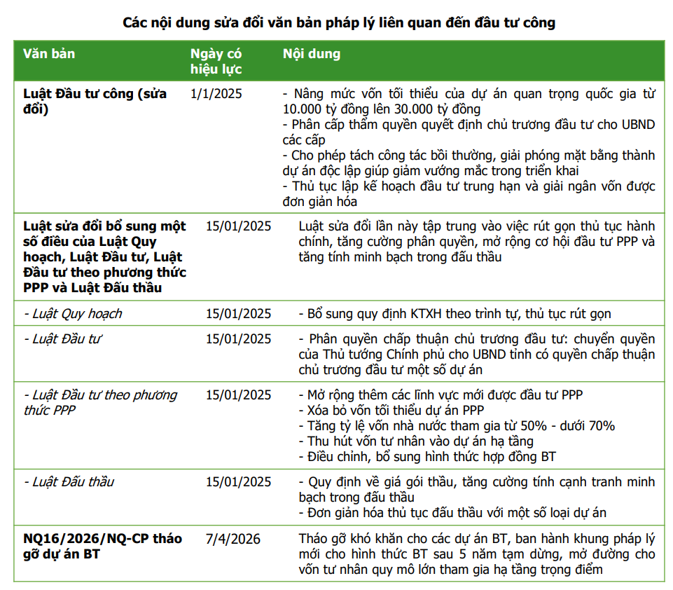Các quy định mới cũng xử lý các khó khăn về giải phóng mặt bằng, huy động vốn, các dự án BT. Nhờ đó, giải ngân đầu tư công được kỳ vọng sẽ tăng tốc trong giai đoạn mới 2026 – 2030. Các dự án trọng điểm (cao tốc, vành đai, cảng hàng không, đường sắt) đã được tháo gỡ từ đầu năm, hoàn tất thủ tục đầu tư và bàn giao vốn.