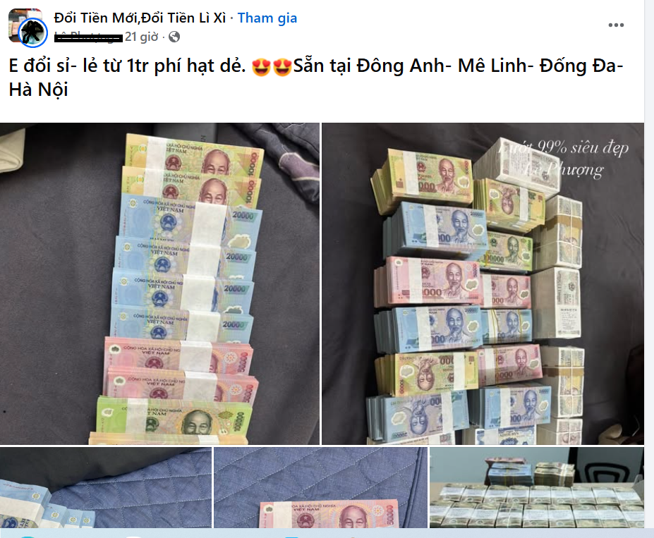 Tại một trang Facebook chuyên đổi tiền mới, một người đăng nhu cầu đổi mỗi mệnh giá 10.000 đồng, 20.000 đồng, 50.000 đồng và 200.000 đồng, mỗi loại một tệp. Chỉ sau vài phút, hàng loạt bình luận chào mời xuất hiện với mức phí chung khoảng 8%. Riêng tiền mệnh giá 1.000 đồng, nhiều đầu mối báo mức phí lên tới 1,2 lần, tức đổi 100.000 đồng phải trả thêm 120.000 đồng, với lý do tiền hiếm, gần như không còn lưu thông.