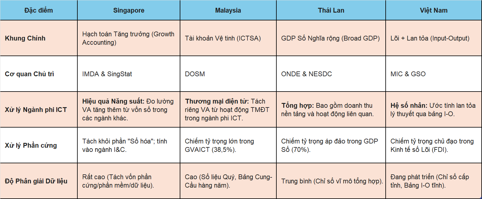Các phân tích cho thấy sự phân hóa rõ rệt trong mức độ trưởng thành của hệ thống thống kê và triết lý đo lường. Singapore áp dụng mô hình hạch toán tăng trưởng (Growth Accounting) tiên tiến, tập trung vào giá trị gia tăng (VA) và hiệu quả năng suất từ việc áp dụng công nghệ trong các ngành phi CNTT. Malaysia vận hành hệ thống Tài khoản Vệ tinh CNTT (ICTSA) chuẩn mực, tách biệt rõ ràng giữa công nghiệp ICT và thương mại điện tử. Thái Lan thể hiện sự nghịch lý giữa con số đóng góp GDP "nghĩa rộng" rất cao (gần 24%) do tính gộp cả doanh thu phần cứng và nền tảng, so với giá trị gia tăng cốt lõi thấp (3.4%), phản ánh sự phụ thuộc vào gia công. Việt Nam, với mục tiêu tham vọng đạt 30% GDP vào năm 2030, đang trong quá trình chuyển đổi phương pháp luận từ thống kê sản lượng phần cứng sang các mô hình Bảng cân đối liên ngành (Input-Output) phức tạp hơn để nắm bắt hiệu ứng lan tỏa, song vẫn đối mặt với thách thức về dữ liệu đầu vào.