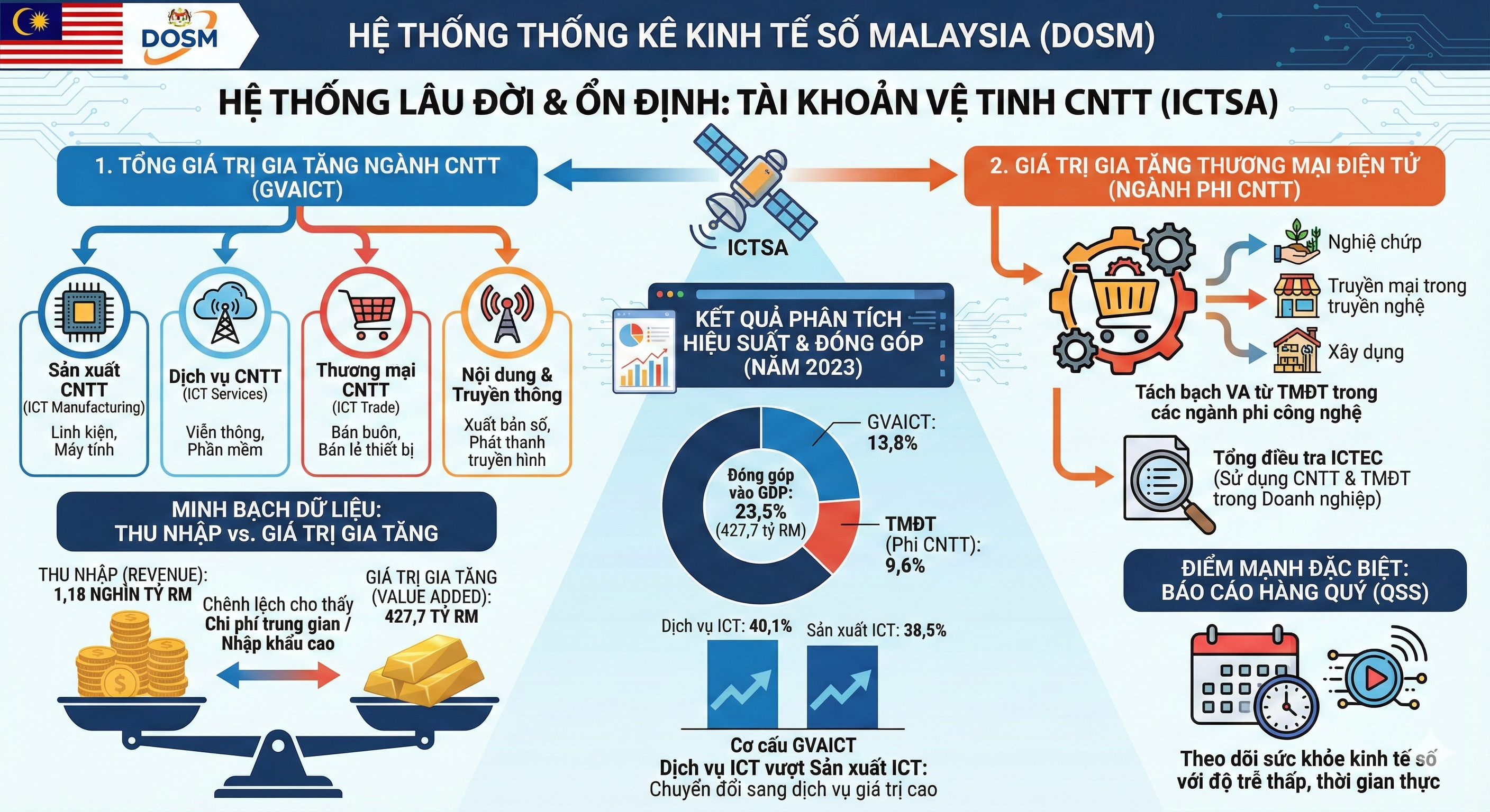 Malaysia sở hữu một trong những hệ thống thống kê kinh tế số lâu đời và ổn định nhất khu vực, được vận hành bởi Cục Thống kê Malaysia (DOSM). Phương pháp của Malaysia dựa trên hệ thống Tài khoản Vệ tinh CNTT (ICTSA), cung cấp một cái nhìn cân bằng giữa sản xuất phần cứng và dịch vụ thương mại điện tử.