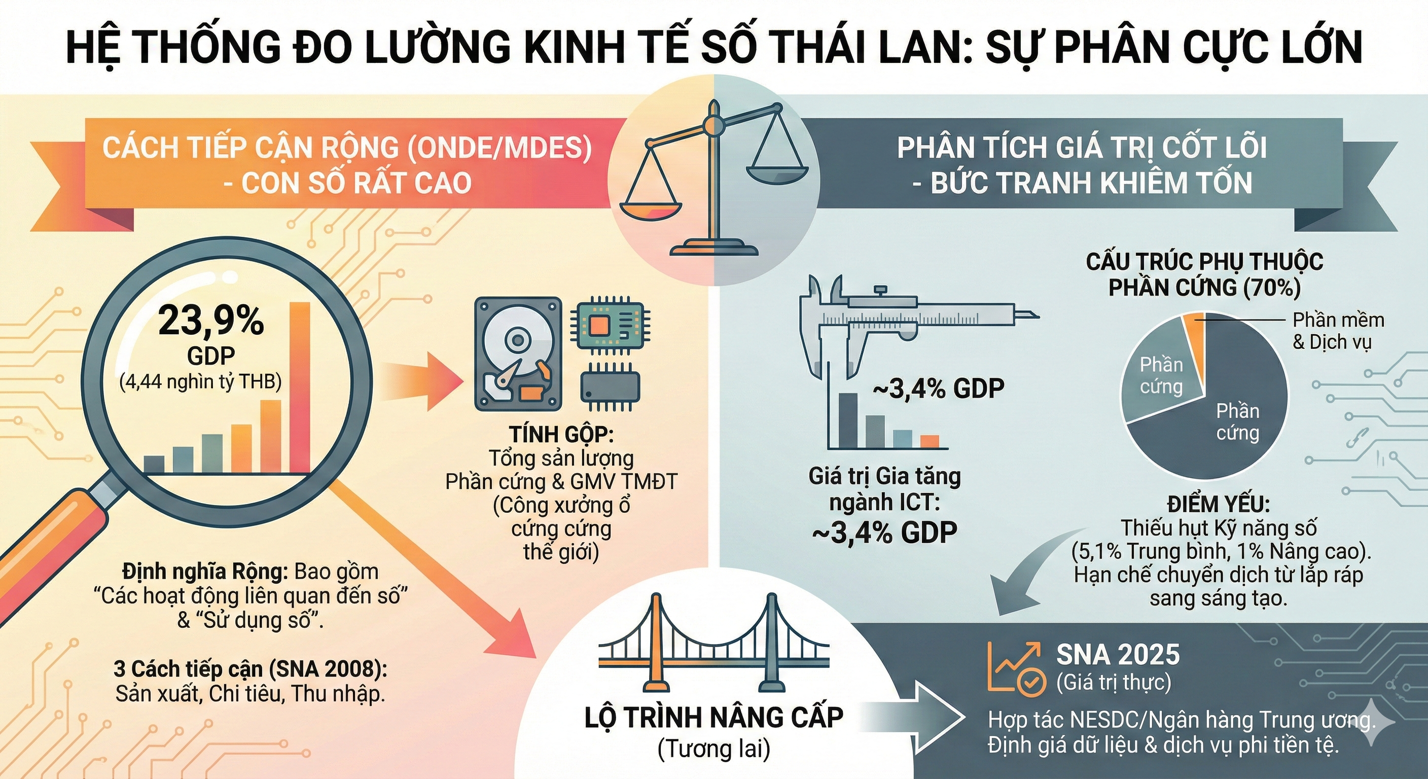 Thái Lan có Hệ thống đo lường thể hiện sự phân cực lớn nhất trong khu vực. Một mặt, các cơ quan như Ủy ban Kinh tế và Xã hội Số Quốc gia (ONDE) công bố những con số đóng góp GDP rất cao theo định nghĩa rộng. Mặt khác, các phân tích về giá trị gia tăng cốt lõi lại cho thấy một bức tranh khiêm tốn hơn nhiều, phản ánh cấu trúc kinh tế phụ thuộc vào sản xuất phần cứng nước ngoài.