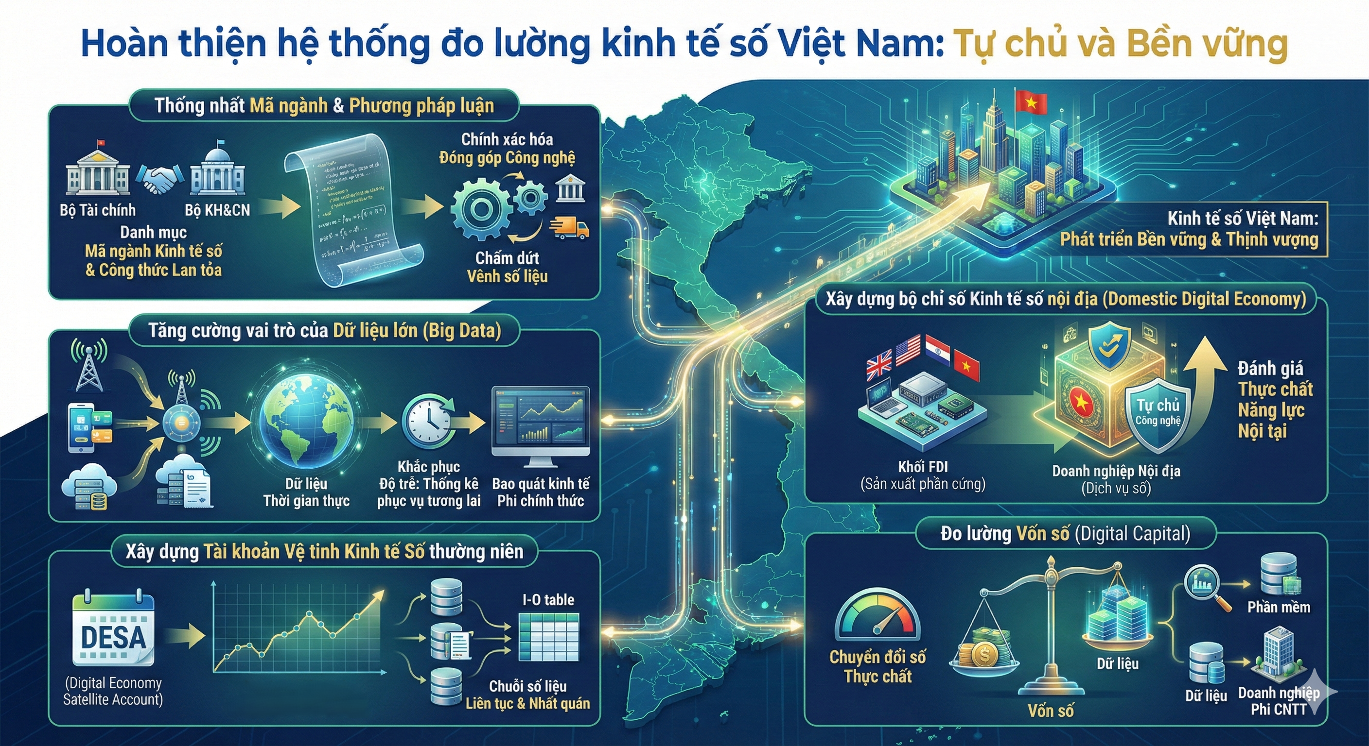 Xây dựng Tài khoản Vệ tinh Kinh tế Số thường niên: Thay vì dựa vào các tính toán rời rạc trên bảng I-O cũ, cần thiết lập một hệ thống Tài khoản Vệ tinh (DESA) để có chuỗi số liệu liên tục và nhất quán.
