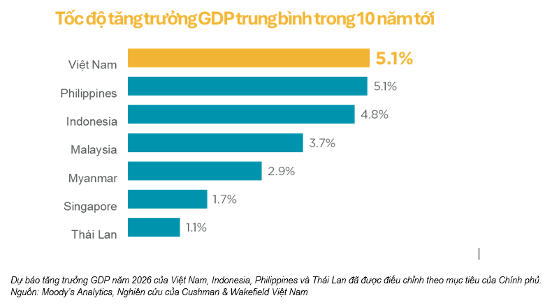 Theo Cushman & Wakefield, Việt Nam đang đứng trước một giai đoạn bản lề, nơi nền tảng kinh tế và quy hoạch đô thị ngày càng liên kết chặt chẽ. Với quy mô thị trường nội địa lớn, dòng vốn FDI ổn định, cùng định hướng phát triển đô thị tích hợp, quốc gia này được đánh giá có vị thế thuận lợi để bước vào chu kỳ tăng trưởng đô thị tiếp theo theo hướng chiến lược và bền vững hơn.