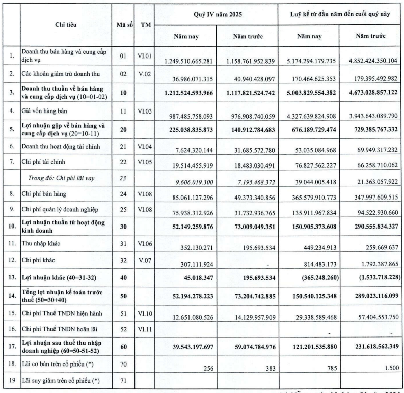 Theo báo cáo tài chính quý 4/2025, CTCP Cao su Đà Nẵng (HOSE: DRC) ghi nhận doanh thu thuần đạt 1.212 tỷ đồng, tăng 8,5% so với cùng kỳ năm trước. Giá trị sản xuất thực tế đạt 1.341 tỷ đồng, tăng 14% so với quý 4/2024, cho thấy hoạt động sản xuất kinh doanh cốt lõi vẫn duy trì đà tăng trưởng ổn định.