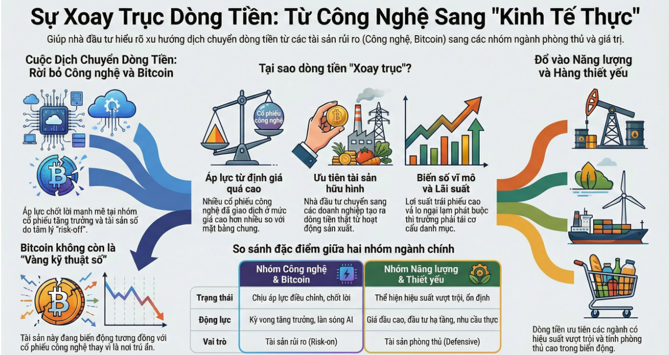 Rotation sang năng lượng, vật liệu và hàng thiết yếu cho thấy một thông điệp quan trọng: thị trường đang bước vào giai đoạn mà nền kinh tế thực được đánh giá cao hơn so với kỳ vọng tăng trưởng thuần túy.
