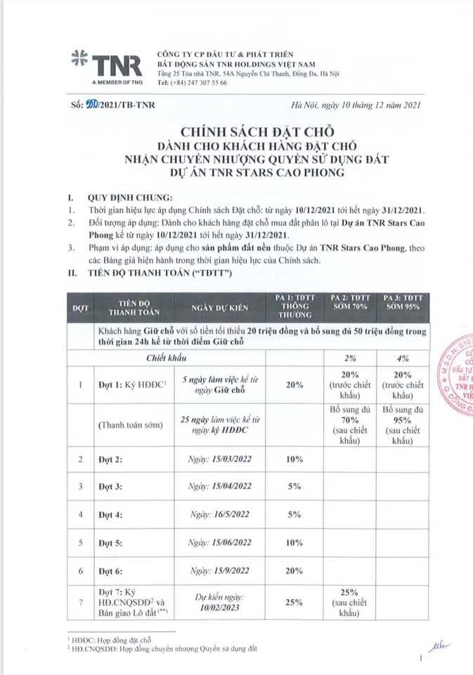Theo chính sách đặt chỗ của TNR Holdings, thời gian hiệu lực áp dụng Chính sách đặt chỗ từ ngày 10/12/2021 tới tối ngày 31/12/2021. Đối tượng áp dụng là khách hàng đặt cọc mua đất tại Dự án TNR Start Cao Phong, kể từ ngày 10/12/2021 đến ngày 31/12/2021. Khách hàng giữ chỗ với số tiền tối thiểu 20 triệu đồng và bổ sung đủ 50 triệu đồng trong thời gian 24h kể từ thời điểm giữ chỗ.