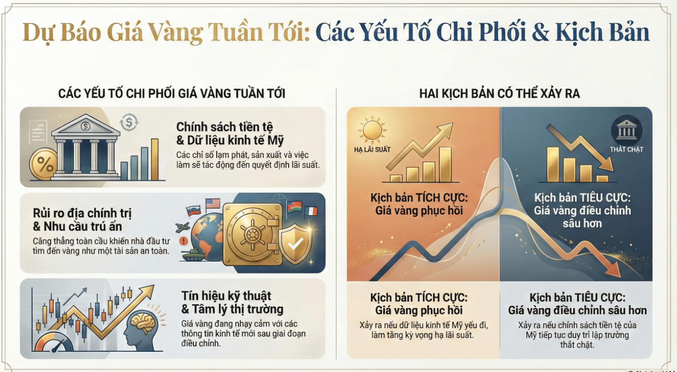 Trong bối cảnh hiện tại, giá vàng được dự báo tiếp tục biến động mạnh trong tuần tới với nhiều phiên tăng – giảm đan xen. Mặc dù nhiều yếu tố trung và dài hạn vẫn ủng hộ giá vàng, diễn biến ngắn hạn sẽ phụ thuộc phần lớn vào các thông tin kinh tế được công bố trong tuần, đặc biệt từ phía Mỹ, cũng như tâm lý thị trường trước các rủi ro toàn cầu.