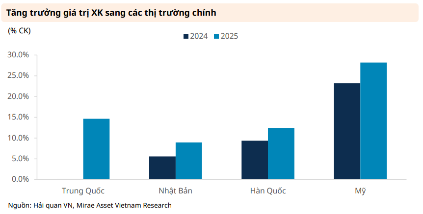 Đáng chú ý, xuất khẩu sang các thị trường lớn đều tăng tốc. Mỹ tiếp tục là thị trường dẫn dắt với mức tăng 28,2%, trong khi Trung Quốc ghi nhận sự phục hồi rõ rệt với mức tăng 14,7%, đảo chiều so với trạng thái gần như đi ngang của năm 2024. Xuất khẩu sang Hàn Quốc và Nhật Bản cũng tăng lần lượt 12,5% và 8,9%.