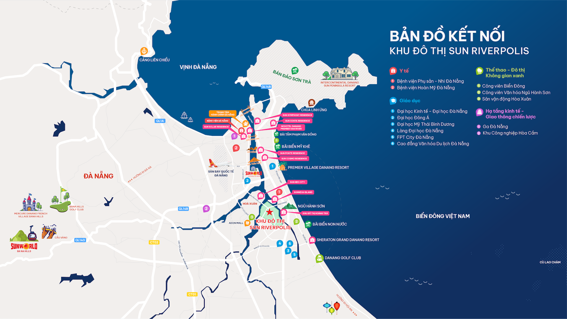Điểm nhấn đầu tiên của tổ hợp căn hộ FourS Tower - "trái tim" khu đô thị sinh thái Sun Riverpolis do Sun Group kiến tạo tại Nam Đà Nẵng - chính là vị trí chiến lược tại giao lộ Nguyễn Phước Lan - Minh Mạng. Từ đây, cư dân kết nối nhanh chóng với các trục giao thông huyết mạch và những nút giao hiện đại như Hòa Xuân, Đồng Nò 2, giúp rút ngắn đáng kể thời gian di chuyển hàng ngày.
