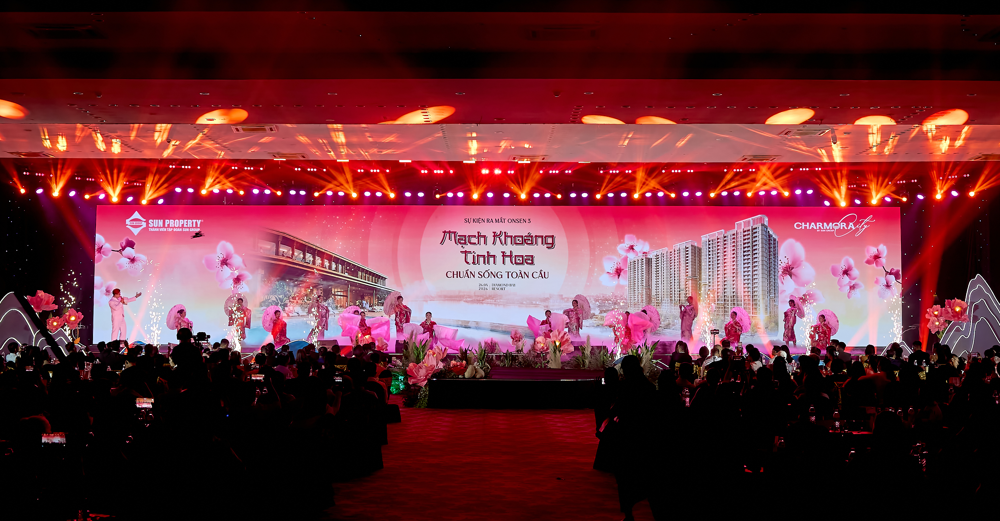 Từ rất sớm, bầu không khí sôi động đã bao trùm khán phòng Diamond Bay Resort. Lấy cảm hứng từ mạch nguồn khoáng nóng quý giá ẩn sâu trong lòng đất, Sun Property đã biến không gian sự kiện thành một triển lãm nghệ thuật sang trọng. Ý tưởng chủ đạo xuyên suốt là hành trình khám phá mạch khoáng thiên nhiên – đặc quyền đắt giá nhất giúp mang trải nghiệm trị liệu chuẩn Nhật về ngay thềm nhà cho mỗi chủ nhân Onsen 3.