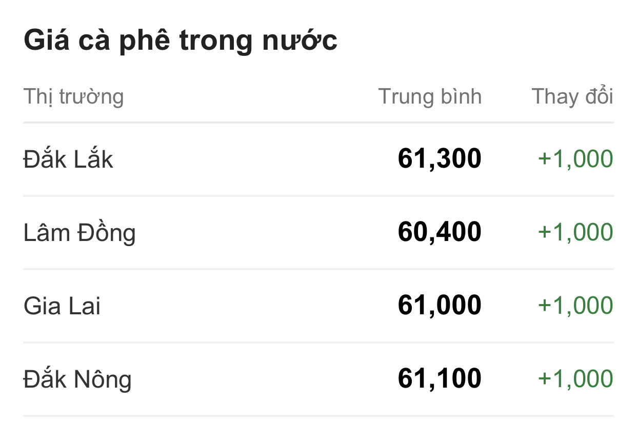 Cụ thể, các địa phương đang thu mua cà phê với giá trong khoảng 60.400 - 61.300 đồng/kg.