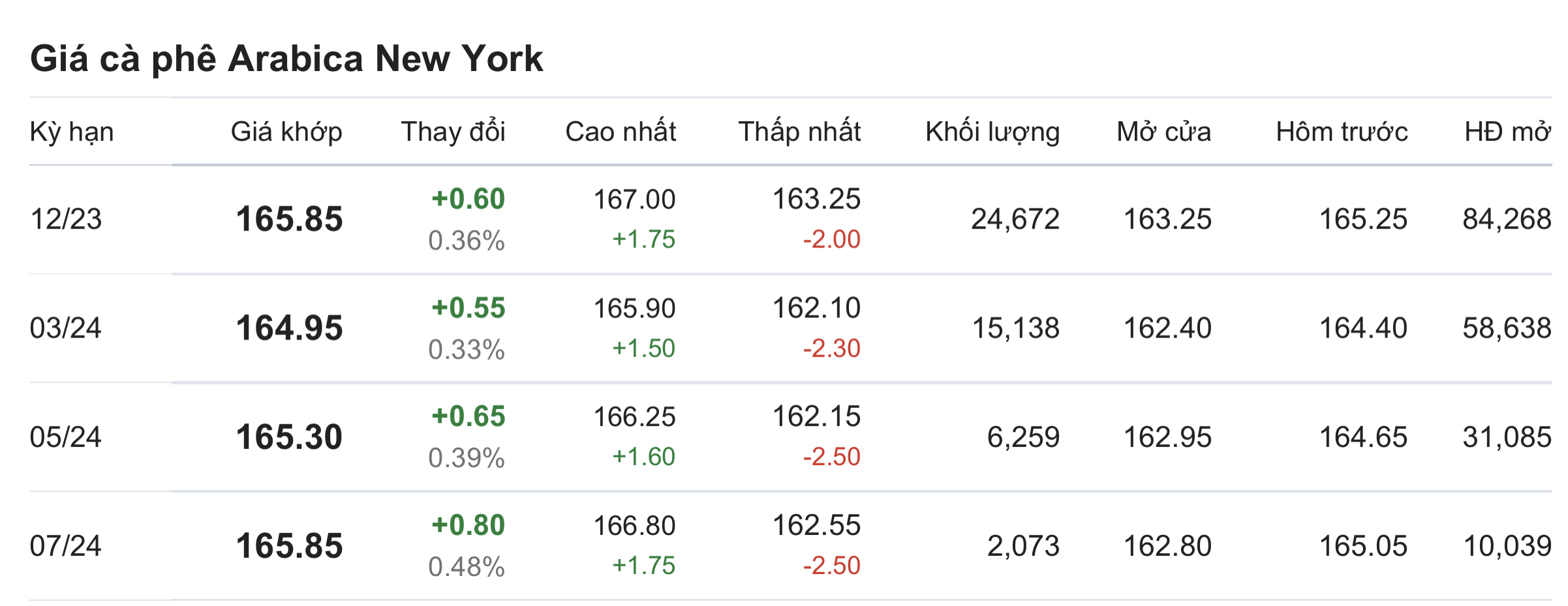 Giá cà phê arabica giao tháng 12/2023 tại New York ở mức 165,85 US cent/pound sau khi tăng 0,36% (tương đương 0,6 US cent) tại thời điểm khảo sát vào lúc 7h22 (giờ Việt Nam).