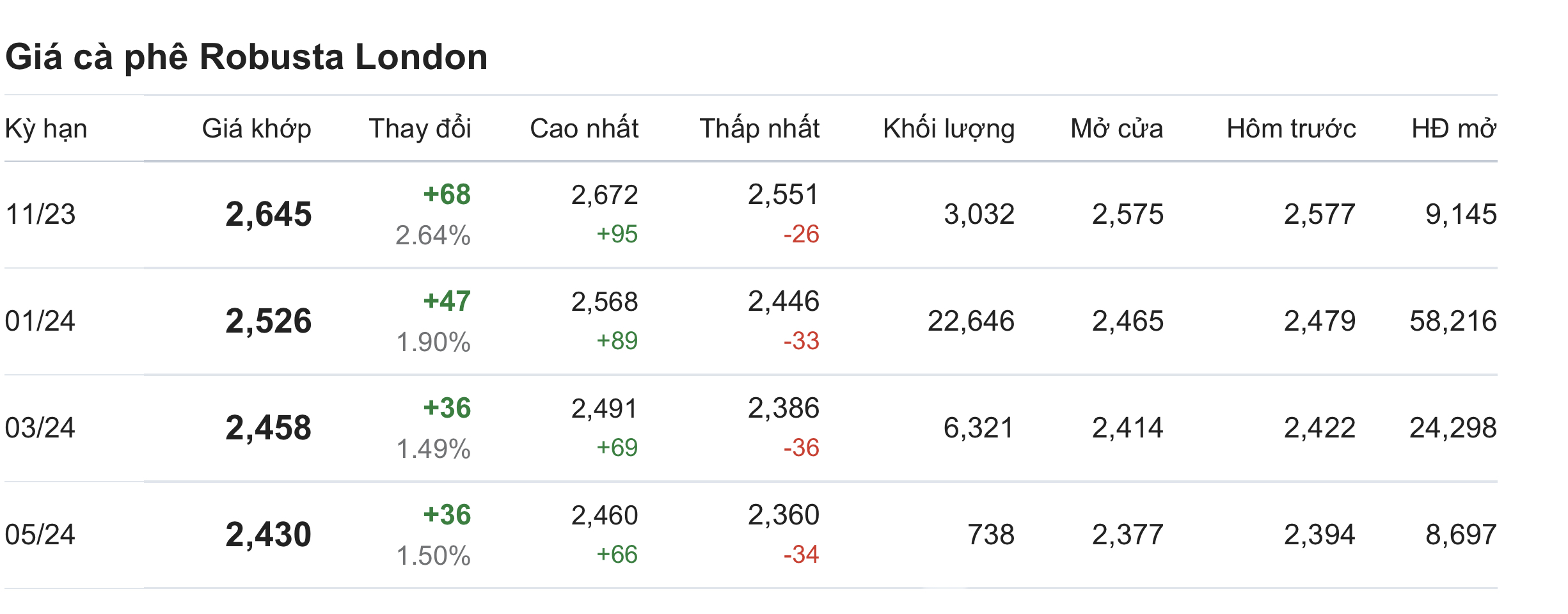 Theo ghi nhận, giá cà phê trên thị trường thế giới tăng. Theo đó, giá cà phê trực tuyến robusta tại London giao tháng 11/2023 được ghi nhận tại mức 2.645 USD/tấn sau khi tăng 2,64% (tương đương 68 USD).